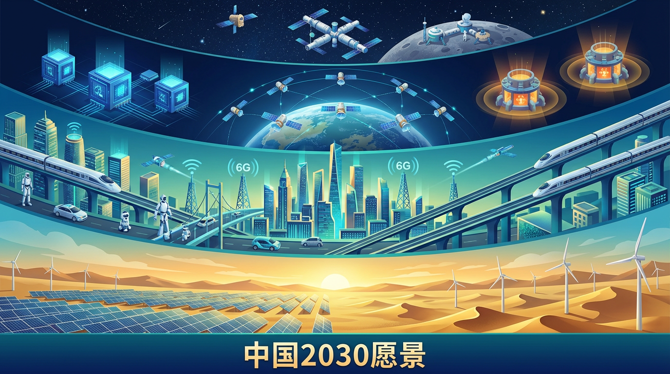 提示词: 一幅宏大的全景分层插画,展现中国2030年的发展蓝图。画面从下到上分为多层:最底层是戈壁沙漠上延绵的光伏板阵列和白色风力发电机组,金色沙丘映着夕阳;中间层是璀璨的智慧城市,矗立着6G信号塔,无人驾驶汽车和人形机器人穿行其间,高架上飞驰着银色子弹头高铁;上层是环绕地球的卫星群、散发蓝色冷光的量子计算机、以及辐射温暖能量的核聚变装置;最顶端是星空中的中国空间站和月球科研基地。配色:深海蓝、电光青、暖金色、翡翠绿。等距透视,超精细,矢量风格配渐变质感,未来感与现实感并存。 --ar 16:9