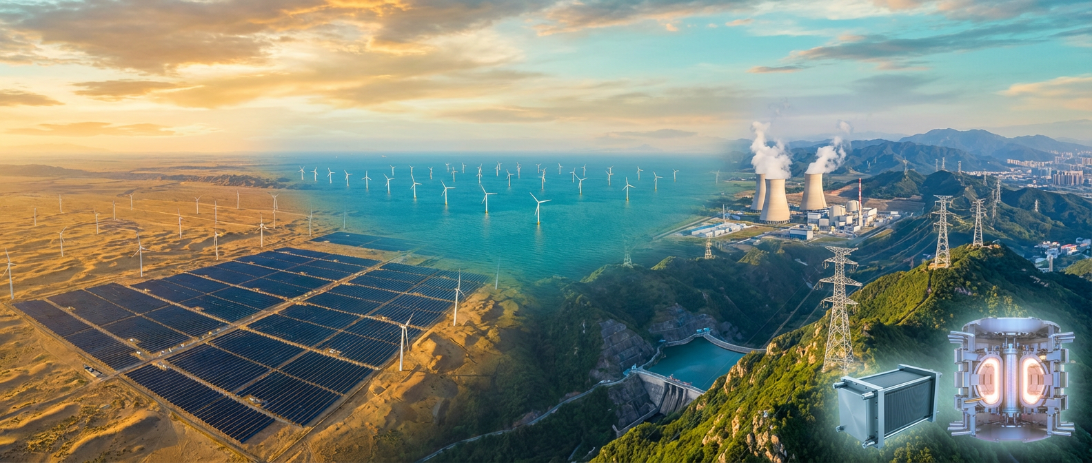 提示词: 壮丽的航拍视角,展现中国绿色能源革命的全景画卷:戈壁荒漠上一望无际的光伏阵列和风机群在绚烂晚霞下延伸,碧蓝海面上矗立着海上风电机组,现代核电站冷却塔只排放洁白蒸汽,特高压输电铁塔跨越崇山峻岭将西部电力输送东部,绿色群山间坐落着抽水蓄能电站。角落点缀:氢燃料电池和托卡马克聚变装置微光闪烁。黄金时刻光线,航拍摄影质感,暖琥珀色与冷青色的和谐搭配。 --ar 21:9