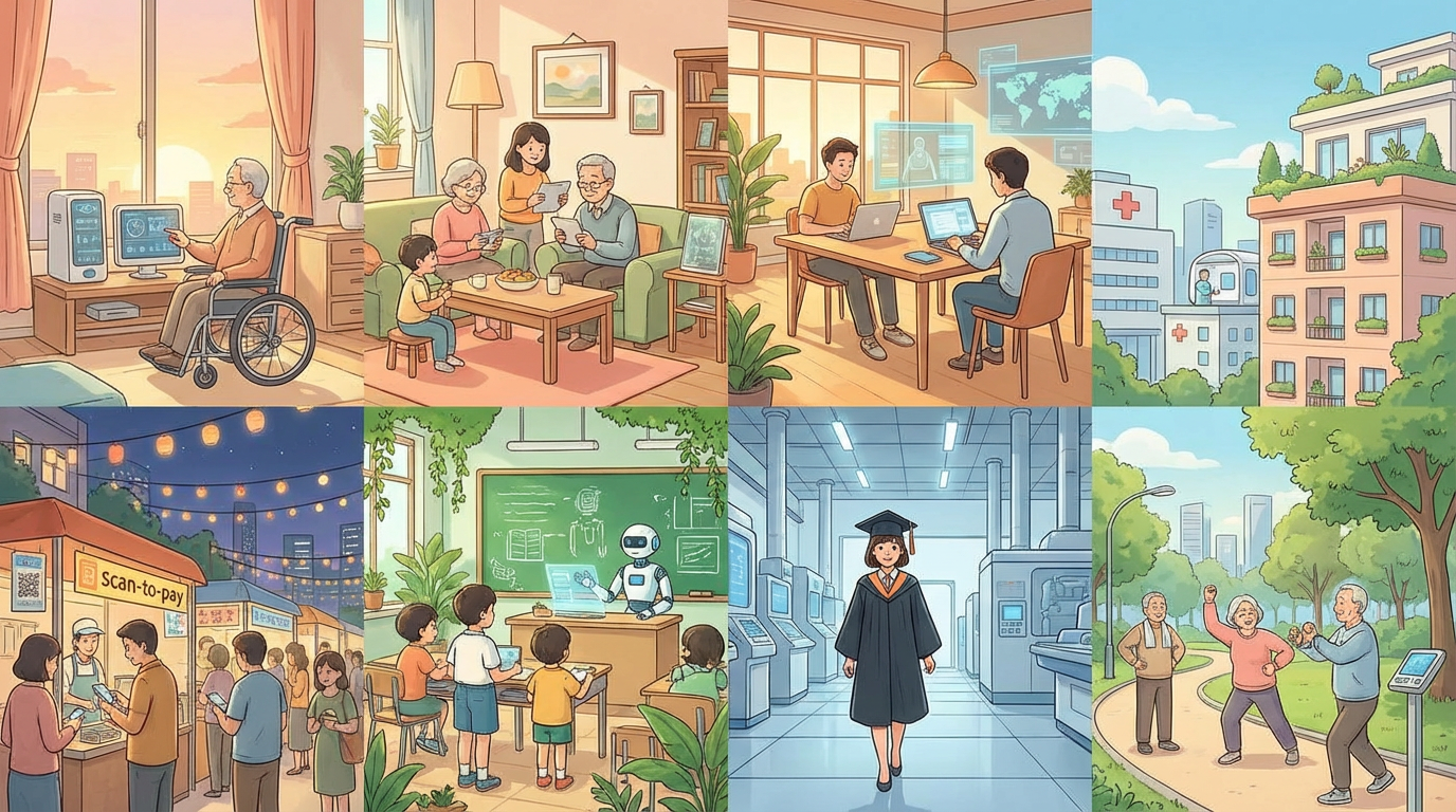 提示词: 一幅温暖而充满希望的插画,描绘2030年中国人的幸福生活:多代同堂的家庭场景中,老人在现代社区中心使用智能健康设备,父母在阳光充沛的共享办公空间用全息屏幕远程工作,孩子在充满绿植的教室里跟AI老师互动学习,一位年轻毕业生自信地走进高科技工厂。背景元素:配备远程医疗舱的现代医院、屋顶花园的保障性住房、热闹的夜市中扫码支付的场景、老人们在智慧公园里使用健身追踪设备锻炼。配色:温暖日出色调、柔和桃粉、天空蓝、自然绿。吉卜力式温馨感与现代设计融合,柔和光线。 --ar 16:9