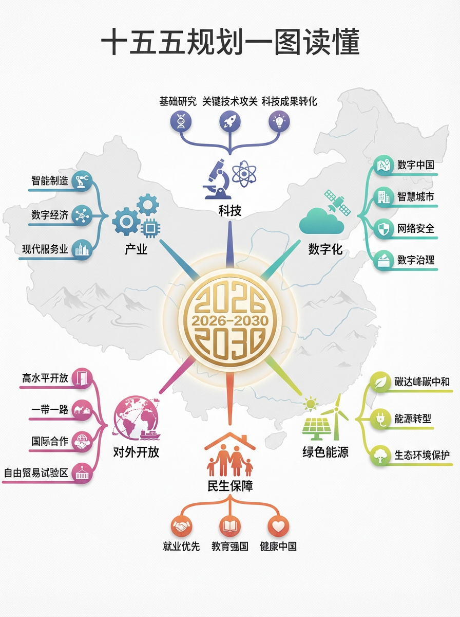 提示词: 一张简洁现代的中国风信息图海报,标题"十五五规划一图读懂"。放射状思维导图布局,中央是金色徽标"2026-2030"。六条主分支向外延伸并配有图标:(1) 齿轮与芯片代表产业,(2) 显微镜与原子代表科技,(3) 云朵与卫星代表数字化,(4) 光伏板与风机代表绿色能源,(5) 家庭剪影代表民生保障,(6) 地球与贸易航线代表对外开放。每个分支有3-4个子项配简洁中文标签。背景是浅灰色中国地形纹理。扁平化设计,Material Design配色,专业数据可视化风格。 --ar 3:4
